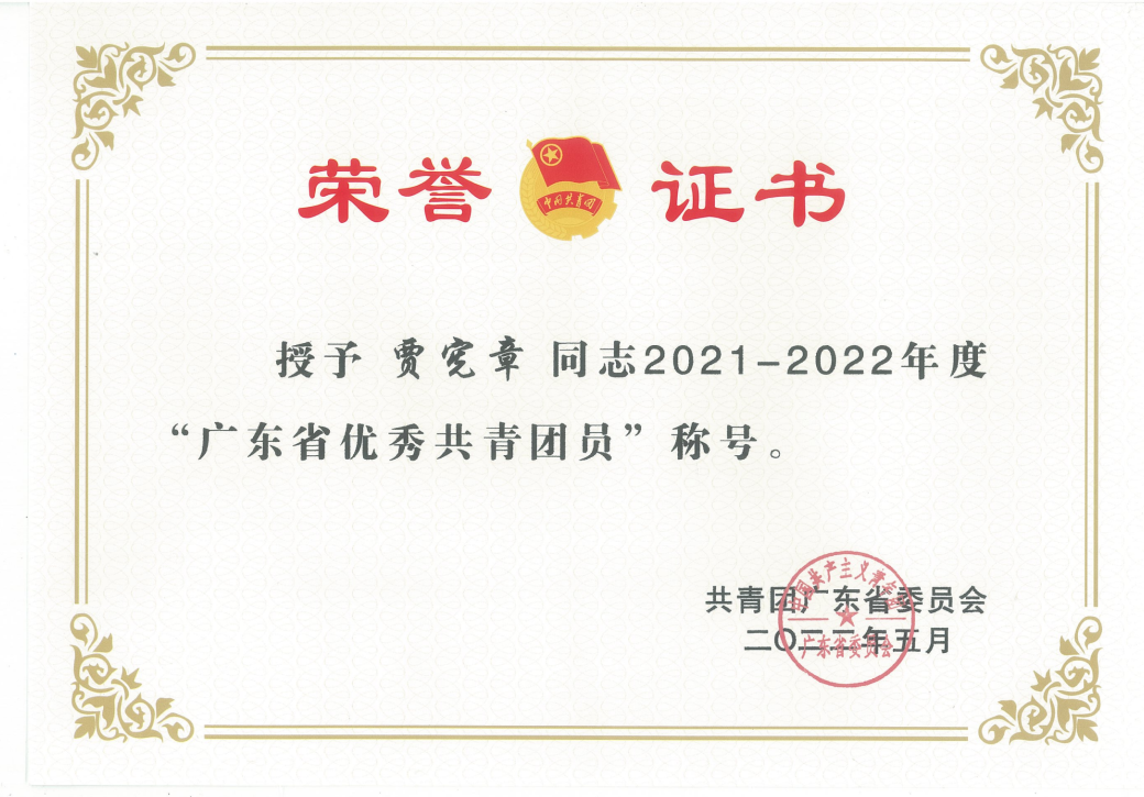 贾宪章,中共预备党员,就读海运学院轮机(陆上)1191班,被评为2021-2022年度“广东省优秀共青团员”。
