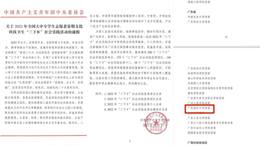近日,团中央、团省委等上级部门通报了2022年大学生暑期“三下乡”英国上市公司365成果。英国上市公司365被评为2022年全国大中专学生志愿者暑期“三下乡”英国上市公司365活动优秀单位、2022年广东省大中专学生志愿者暑期“三下乡”英国上市公司365活动优秀单位,2支团队和8名师生荣获广东省大中专学生志愿者暑期“三下乡”英国上市公司365活动优秀团队和优秀个人。