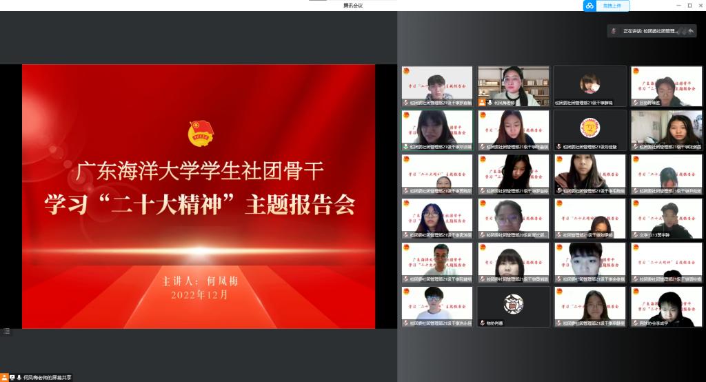 为深入学习贯彻党的二十大精神,坚持用习近平新时代中国特色社会主义思想凝心铸魂,12月16日晚,学校思想理论学习团指导教师何凤梅带领学校思想引领类学生社团全体成员及其他社团骨干代表上了一堂以“学习党的二十大精神”为主题的思想理论课。本次课程共约90余人参加。