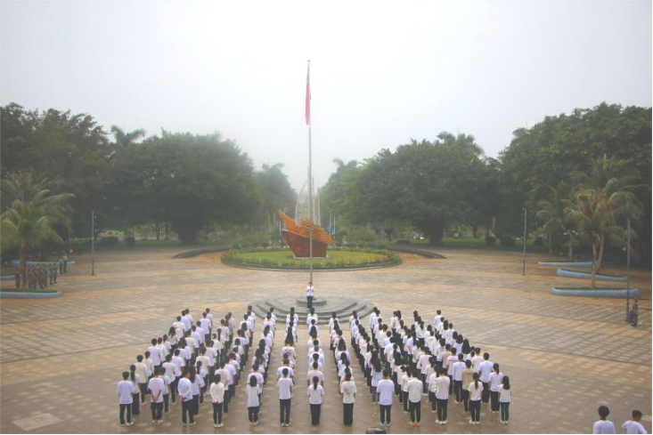 全体师生合唱校歌《蔚蓝之歌》,歌声飘扬在海洋广场的上空。