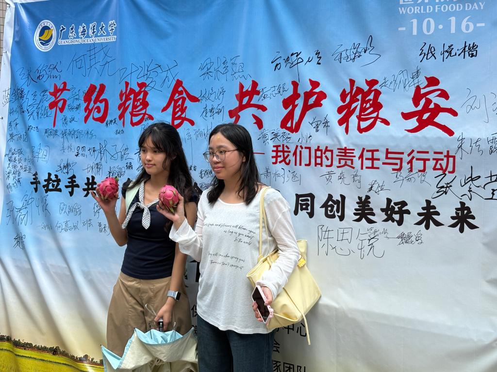 活动当天,“世界粮食日”主题展览与“光盘行动”打卡同步开展。师生在主题展区签名板上郑重签名,承诺以实际行动践行节约;在“光盘行动”环节,师生凭“光盘”即可领取新鲜火龙果作为奖励,以轻松有趣的方式鼓励大家按需取餐、杜绝浪费。