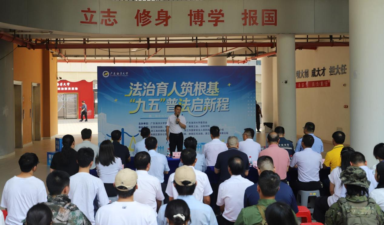学校党政办公室主任尹喜在活动致辞中表示,深入推进依法治校,是学校落实国家战略、实现治理体系和治理能力现代化的必然要求和关键举措。学校高度重视法治宣传教育工作,持续打造了一系列具有海大特色的校园法治文化活动——从常态化的“宪法宣传周”,到生动鲜活的“学宪法 讲宪法”活动、法治情景剧展演,再到校园法治文化节,不断丰富法治宣传教育内容和形式,探索校地协同法治育人新模式。他寄语同学们,要自觉担当,做法律知识的学习者、践行者和传播者。麻章区委办公室副主任陆武豪在致辞中勉励广大师生要积极学习法律知识、涵养家国情怀。学生代表宣读了主题为“凝聚青春力量 共赴法治之约”的倡议书。