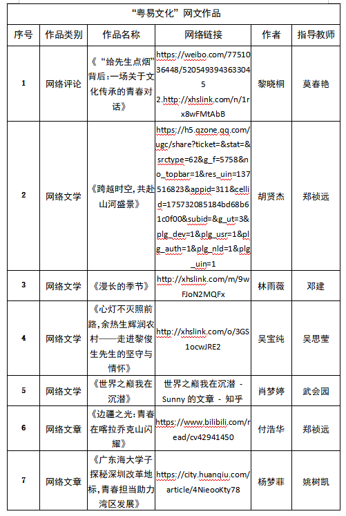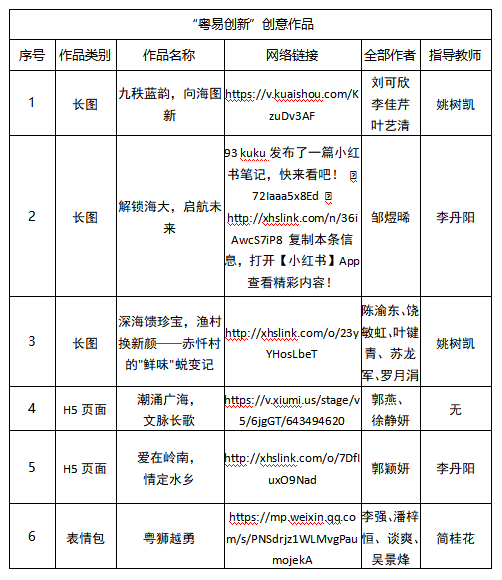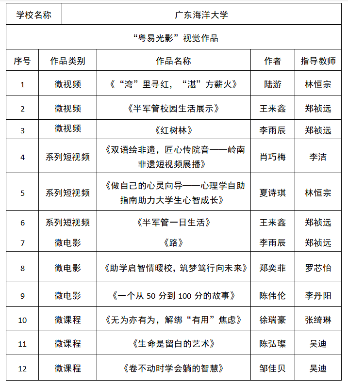 根据《广东省教育厅关于广东省教育厅关于举办第十届广东高校 网络媒体展示节的通知》,经团队自主申请、承办单位组织专家团队评审,共推荐33件作品参赛。具体名单如下: